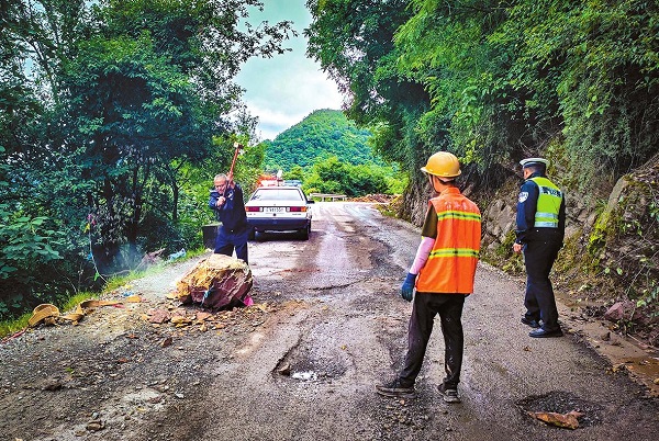 大石滚落拦路 民警砸碎保通