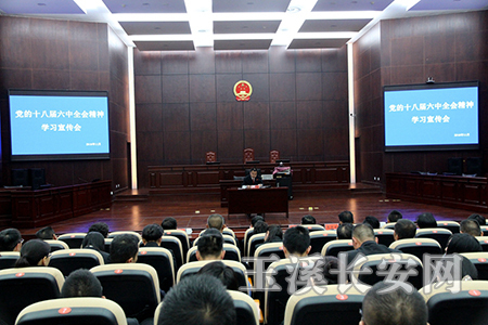 11月7日下午,玉溪中院在机关大法庭召开党员大会,深入学习贯彻党的十八届六中全会精神。会议由党组成员、政治部主任旃红彬主持,中院在家的党组班子成员及全院党员共计100余人参加了会议。