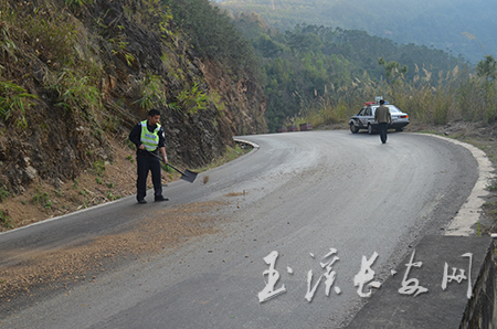 近日,峨山岔塔线塔甸坡发现滴漏的汽油,污染路面近三公里,极易引发交通事故。峨山交警大队岔河中队民警获悉后,及时赶赴现场,堵断两头来车,铲土吸附油污。经过3个多小时的努力,油污被清扫干净。(张兰 摄)