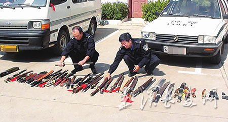 民警清点收缴到的管制刀具 近期,江川县公安局治安大队组织民警开展管制刀具清查收缴行动,收缴管制刀具48把、斧头3把,查处非法销售管制刀具案件3起,抓获嫌疑人3名。 围绕近期接连发生的暴恐人员使用冷兵器实施暴力恐怖犯罪的严峻形势,结合江川实际,江川县公安局治安部门不断加大对辖区内集贸综合市场、日杂商店、五金店、批发市场等场所清查力度。对刀具生产销售企业进行摸排登记,做到底数清、情况明,全面加强管理,严格落实管制刀具销售备案和实名登记制度,清理整治非法管制刀具销售行业。根据治安部门摸排调查获取线索,5月15日,治安大队共出动警力10余人,对江川县前卫镇渔村澄川二级路边的4家青铜器销售点进行突击清查,共收缴管制刀具48把、斧头3把,查处非法销售管制刀具案件3起,抓获嫌疑人3名。 目前,案件正在进一步办理中。(孙吉荣 文/图) 来源:玉溪网 编辑:李艾丽