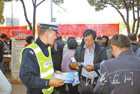 2月25日,峨山县妇联、县总工会联合30家企业在县城西门农贸市场举办“春风行动”现场招聘会,为有创业就业意愿的务工人员提供送岗位、送法律宣传、送职业技能、送创业指导、送小额贷款的“五送”服务。峨山交警以此次现场招聘会为契机,为应聘人员开展交通安全送平安宣传活动。( 谢刚 摄)