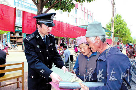 近日,易门县公安局利用县城街天的有利时机,组织禁毒、法制、治安、交警、经侦等部门民警,以发放刊物、宣传手册、宣传单等方式广泛开展宣传教育活动,大力普及安全防范知识,进一步增强广大群众的自我保护意识和防范能力。(李学红 摄)