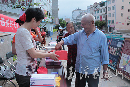 6月24日,红塔区妇联、司法局和玉兴街道联合在中心城区龙马路与迎春街延长线交叉路口附近开展禁毒防艾反邪教宣传活动,除了制作宣传展板和发宣传单外,组织方还别出心裁,开展禁毒知识有奖竞答活动。图为一位市民正在抽取题目参加竞答。(记者 刘黎 摄)