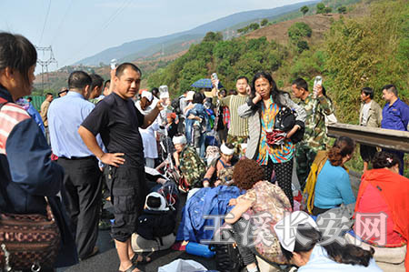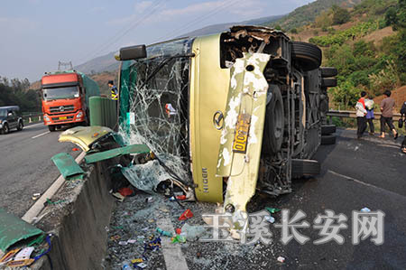 伤者在市人民医院接受治疗 4月8日16时左右,昆磨高速公路玉溪段元江往玉溪方向K154路段(扬武立交附近),一辆载有46人(包含2名儿童)的旅游客车失控侧翻,造成车上人员不同程度受伤,13人住院治疗。 记者从玉溪市公安局高速公路交巡警大队民警处了解到,事发路段属典型山岭高速路,弯多、弯急,容易发生车辆侧滑事故,尤其是下雨天更容易发生事故,因此该路段在2014年重新铺设过防滑沥青。事故发生前正下着大雨,16时左右,一辆核载47人,实载46人的旅游客车因紧急制动在K154+400M处侧翻。 事故发生后,高速大队对车辆进行分流,并及时联系了扬武镇、新平县、峨山县、玉溪市急救中心的120救护车辆赶往现场进行施救,还联系了扬武客运站一辆客车对车上其余人员进行转运。17时左右,受伤人员被陆续送往玉溪市人民医院救治,高速大队安排专门人员在医院登记伤者信息,安抚伤者,并及时联系伤者家属,对无需住院治疗的乘客及时联系安排食宿。17时40分左右,大客车上的乘客全部安全转移。20时40分,事故路段大货车、客运车辆均施救完毕,现场交通恢复。 经查,此次事故旅游客车属云南康辉旅游汽车有限公司玉溪分公司,车牌号为云FL0010,车上乘客为西双版纳到昆明的旅游散客,全部为外省游客。 “当时雨很大,雾也很大,感觉车速有点快,突然车一下子就旋转起来,我心想‘完了!’车侧翻后,看到下面是水泥地,心才落了下来。”事情已经过去了10多个小时,但轻微擦伤的乘客杨尧余说起事发时的一幕仍心有余悸。 4月9日上午,记者从玉溪市人民医院了解到,医院在事发当天17时24分接到新平县人民医院医务科希望协助救治的电话后,及时向上级领导进行了汇报,立即在第一时间启动大型车祸救治应急预案,安排包括急诊三区在内的医务科、多个外科科室、医技科室、行政后援部门开设绿色通道,做好迎接伤员准备。从8日18时20分左右到次日零时30分左右,医院共接收42名不同程度的伤员,根据伤情收住院13人,其中包括一名孕妇(待观察)。截止到记者发稿时,所有伤员病情稳定,无生命危险。 从高速大队反馈的信息,事故原因还在进一步调查中。(记者 李志能 特约通讯员 姜艳 通讯员 张广宁摄影报道) 编辑:李海燕