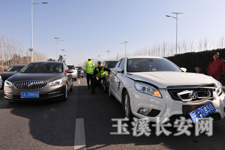峨山县城一路口发生交通事故,致车辆无法发动,车内老人无法动弹,出警民警耐心呵护,第一时间将老人背离危险地带。