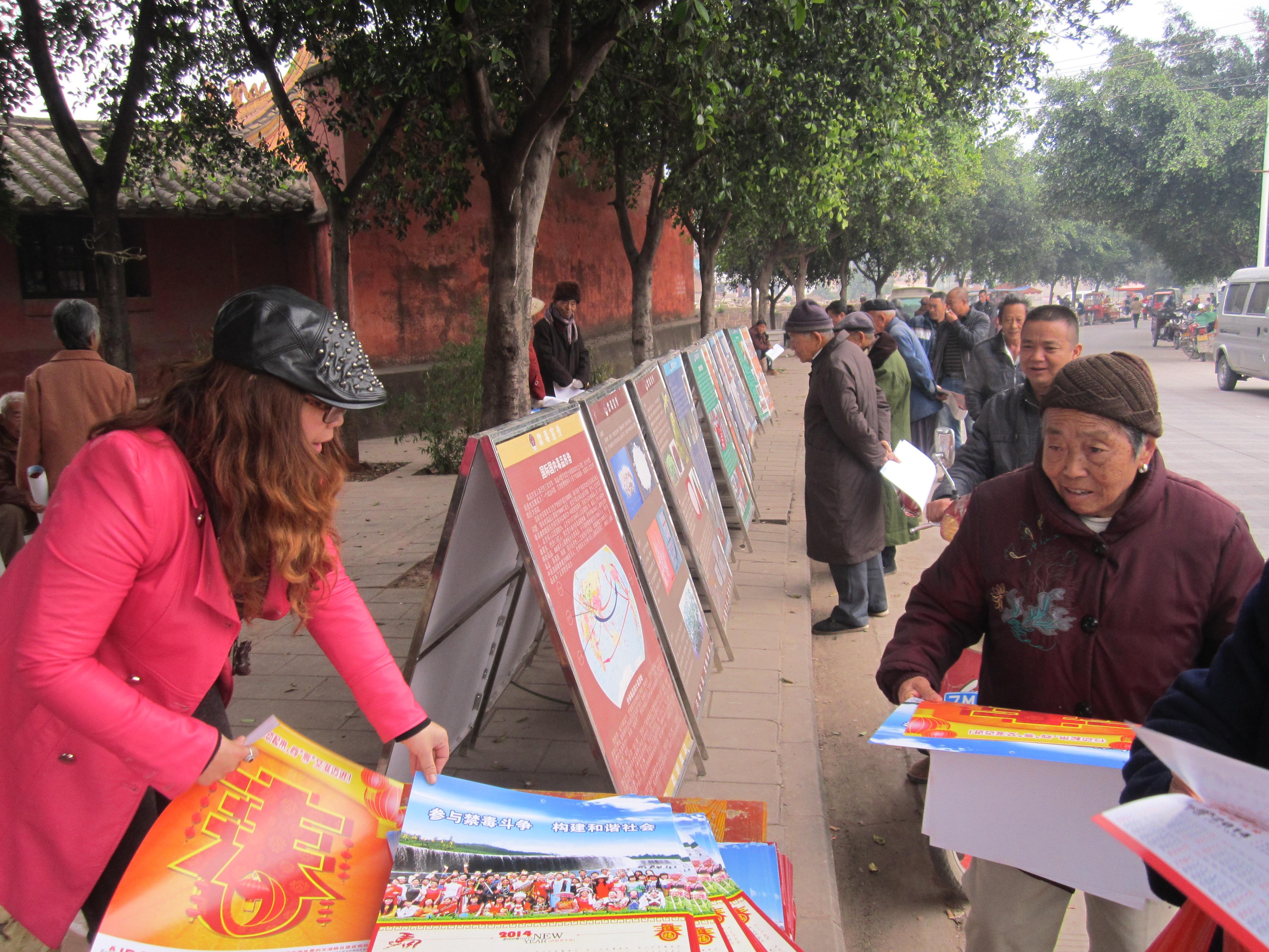 在高古楼,司法所、派出所法制宣传员搭起了宣讲台,通过展板展示、现场讲解、答疑、发放法制宣传册等形式进行普法宣传。与北城司法所、派出所搭台式的宣传不同,北城文化教育中心的人员则利用他们专门从事食品、防艾工作的优势,组织文化事务中心、团工委、计生、妇联、工会、司法所等相关职能部门开展为期一周的“12.1” 、“12.4”宣传日活动。分别深入社区居委会,走进村落送政策、送服务,主动宣传和服务措施。活动主要通过对我处艾滋病疫情相对严重的五个社区居委会(北城社区、王棋社区、古城社区、梅园社区、大营社区)进行禁毒防艾知识宣传。同时在学校开展了青少年法制教育讲座。