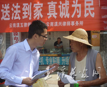 5月29日上午,云南滇玉律师事务所、云南滇兴律师事务所联合红塔区春和司法所,通过对过往市民发放宣传单、讲解生活中困扰的法律问题等方式开展免费法律咨询。据了解,下一步,两家律师事务所还将加强法律咨询服务,走进社区、企业,并对咨询过的市民进行回访,及时给予法律援助服务。(记者 高晶 摄)