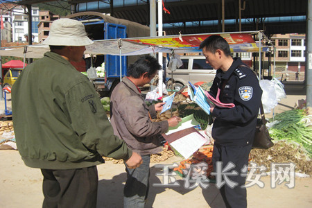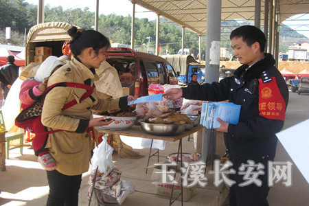 为全力做好春节安保工作,确保辖区群众度过一个平安、欢乐的春节,切实提高群众的安全防范意识和法律意识,2015年2月3日,玉溪市公安局红塔分局小石桥派出所组织民警利用赶集日,到集贸市场深入到群众中积极开展安全防范和法律知识宣传。