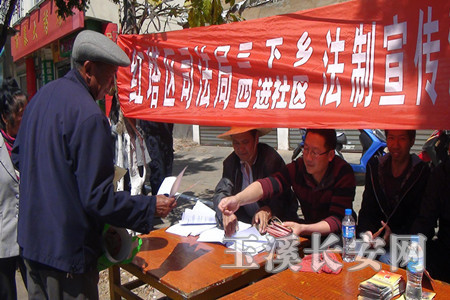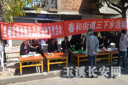 2015年3月5日中午12点30分,春和街道司法所、综治办联合红塔区司法局宣传科与街道妇联、工会、计生、农业、卫生等部门在春和集贸市场门口开展“三下乡四进社区”法制宣传活动。