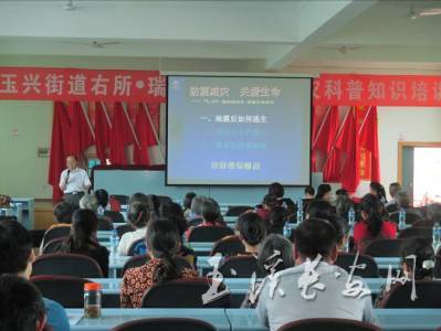 为进一步加强防灾减灾安全培训工作,让防灾减灾深入人心,5月21日下午,玉兴街道农业综合服务中心牵头,右所、瑞新两个社区居委会配合,在右所社区六楼会议室由驻辖区单位居民、志愿者、社区工作人员及居民220余人参加的防灾减灾科普知识讲座。讲座分两个专题进行,一是气象科普知识讲座,邀请红塔区气象局蔡爱萍老师讲授,全面介绍了风、暴雨、雷电、冰雹、寒潮、霜冻、雪、雾、干旱等气象知识,气象与人们的生活衣、食、住、行息息相关;气象与工农业生产的关系;以及全球气候变暖、温室效应、日常生活中如何防雷、气象灾害预警信号等知识。特别强调雷雨天气,行人不要在大树、电线杆、门窗、广告牌下避雨。