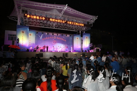 晚会中的节目由省第三强制隔离戒毒所星之港艺术团表演。艺术团成员由戒毒所管教民警和在所戒毒的吸毒人员组成,演出节目由艺术团成员自编自演,内容来源于实际,紧紧围绕吸毒人员的亲身经历和与管教民警间发生的温情故事,真实感人,催人泪下,警醒他人。在现身说法中,吸毒人员几度哽咽,对自己的吸毒行为追悔莫及,忏悔之声使观众席一片静谧,不少观众流下了眼泪。整个演出中演员们的深情表演赢得了观众的阵阵热烈掌声。(丁云燕)