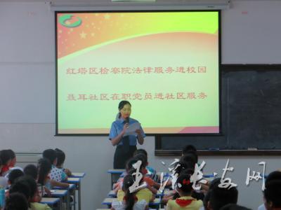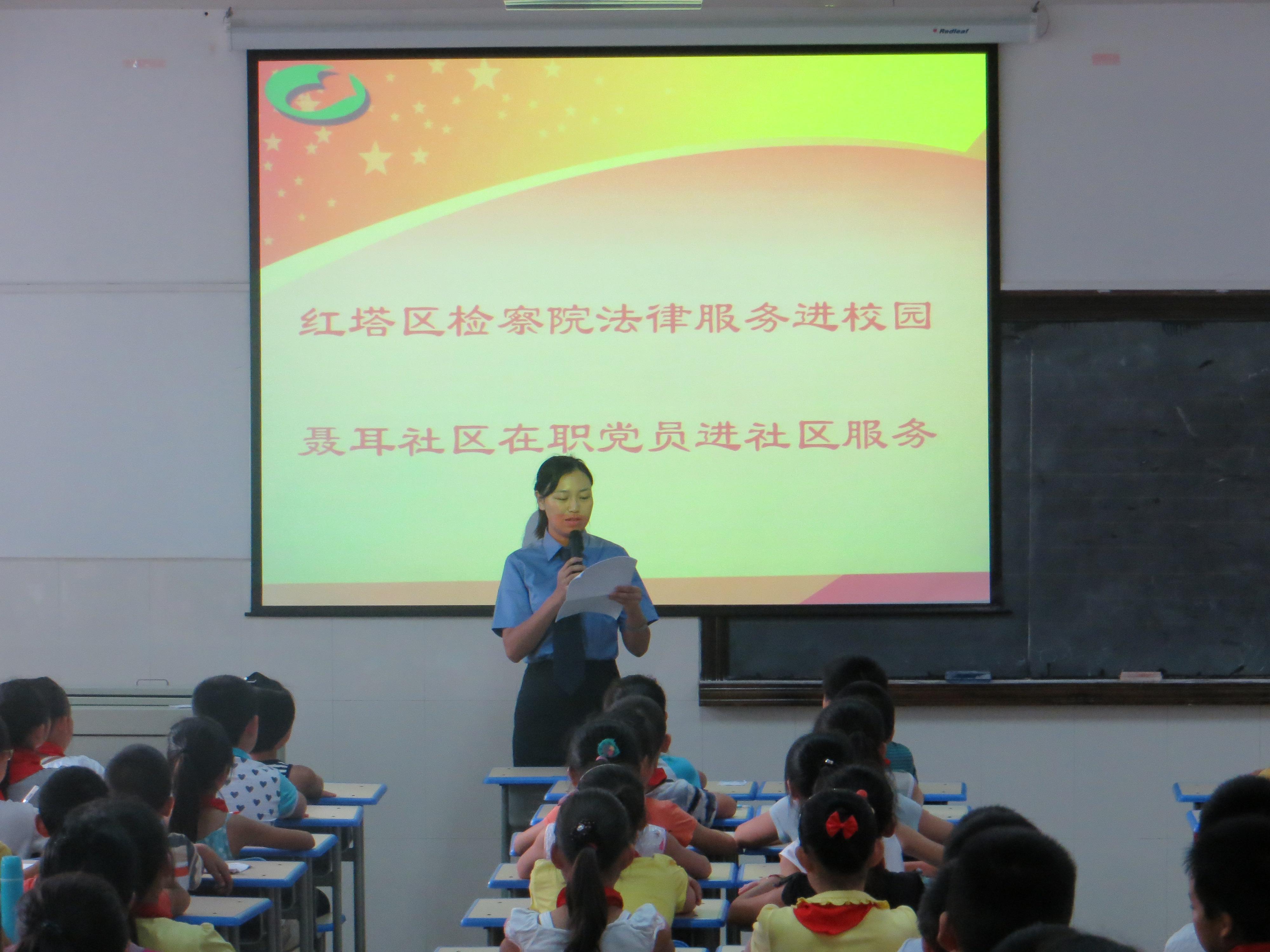 为号召广大学生学法、懂法、知法、守法,弘扬法治精神,增强同学们的法制观念,构建和谐校园。同时也为了深入贯彻落实党的群众路线教育实践活动。2014年6月25日下午,聂耳社区携手红塔区检察院,在聂耳小学阶梯教室开展了关于未成年人保护、未成年人自防自护、校园安全、毒品危害、反恐等一系列法律知识教育讲座。