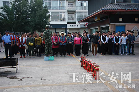近日,市公安局红塔分局玉兴路派出所组织红塔区小庙街商贸城业主、从业人员等共计120余人开展消防演练培训。当天,民警从日常防火注意事项、发生火灾如何自救以及发生火灾时油、电、液化气瓶的安全处置方法、灭火器使用等方面进行了详细的讲解,参训人员还进行了多种方式的现场灭火模拟演练。 (沈林彬 摄)