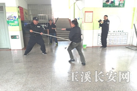 在玉溪市二幼分院操场上,正当小朋友们玩兴正浓时,突然一名陌生男子手持砍刀,试图对在场师生进行攻击,在发现险情后,保安迅速吹响哨子,室外教师立刻有序疏导组织幼儿撤回班级躲避;在室内活动的班级,教师迅速关闭班级门窗,引导幼儿安静有序躲避;在此同时,幼儿园保安与“歹徒”进行搏斗,并成功用抓捕器将其控制,随后“歹徒”被赶来的民警带走,确保了幼儿的安全。