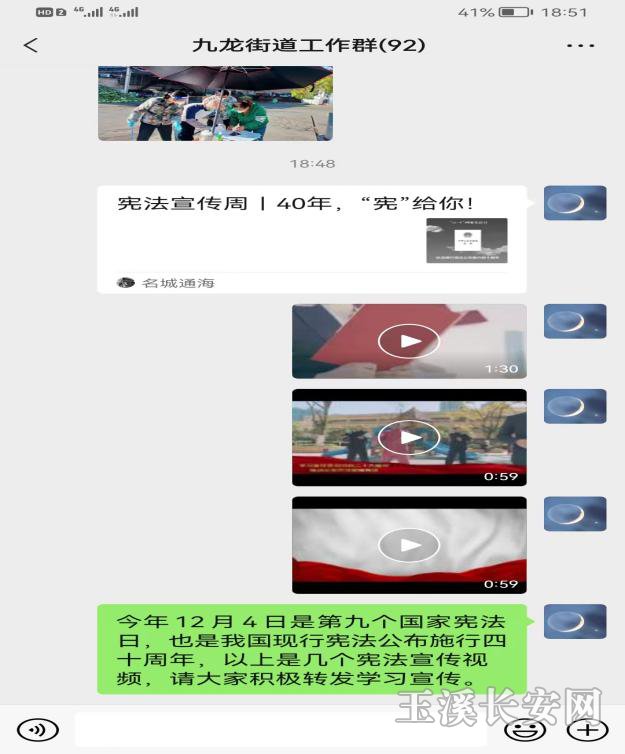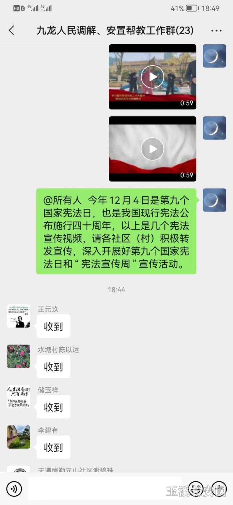 一是在街道办事处工作群、各社区(村)工作群中传达学习了《宪法与国家宪法日》《夯实奋进新时代的宪法根基——党的十八大以来完善宪法维护宪法综述》等文章及丰富多彩的宪法宣传视频,深入宣传学习了关于坚持全面依法治国、推进法治中国建设的重大部署。